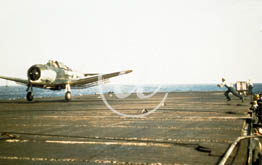 US Navy en couleurs - Série 80-GK- : Un assistant-mécanicien se précipite à la rencontre d'un chasseur qui commence à se poser sur la piste d'un porte-avions.